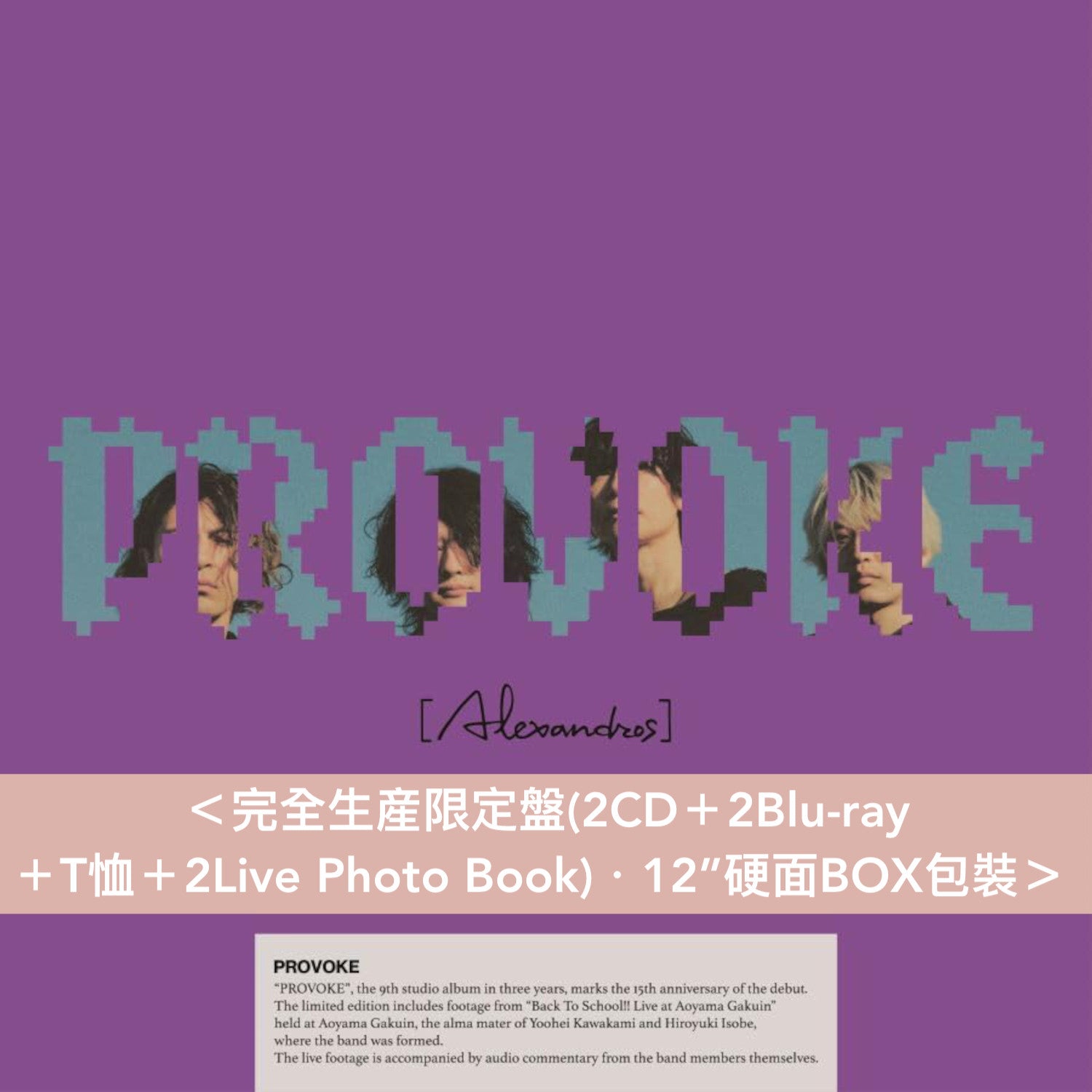 ![[Alexandros] 第9張原創專輯《PROVOKE》<完全生産限定盤(2CD+2Blu-ray+T恤+2Live Photo Book)/初回限定盤(CD+Blu-ray/2DVD+Photo Book)/通常盤(CD)>](http://www.jiphus.com/cdn/shop/files/800x800alexandrosProvokeNol_copy_3.jpg?v=1745186820&width=1445)